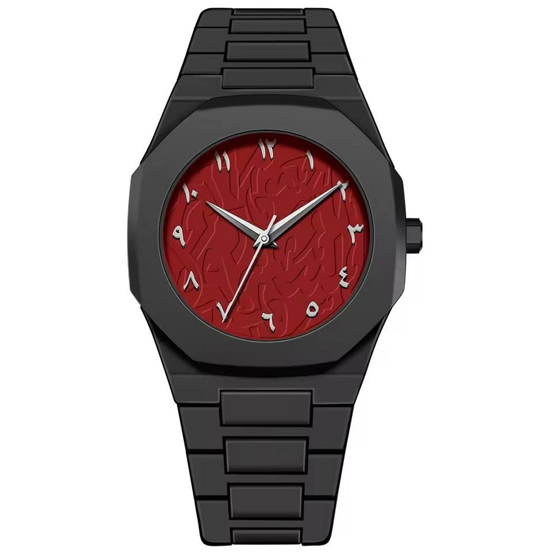 El tiempo cobra carácter en este reloj de diseño audaz, donde el rojo intenso se convierte en el símbolo de la pasión y la determinación. Su caja y correa en negro mate enmarcan una esfera de textura única, grabada con una delicada inspiración árabe que refleja sofisticación y poder visual.